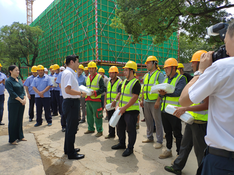 8月21日上午十一点,接近中午烈日炎炎,湘江集团党委书记、董事长张利刚一行来到马博手机入口承建的长沙科技创意园项目,现场看望慰问高温天气下依然坚守战斗在岗位上的广大建设者,为大家送来了冰箱、电风扇、凉茶、藿香正气水、夏桑菊、西瓜等防暑降温用品。